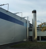 Ein thermischer Solarkollektor mit ca. 140 qm Fläche stellt über einen Großteil des Jahres die nötige Heiz-energie zur Verfügung. Aus dem Abwasser wird mittels einer Wärmepumpe die nutzbare Wärme rückgewonnen, ebenso aus der Fortluft des Schwimmbades. Zwei gasgefeuerte Klein-BHK sichern den Rest.